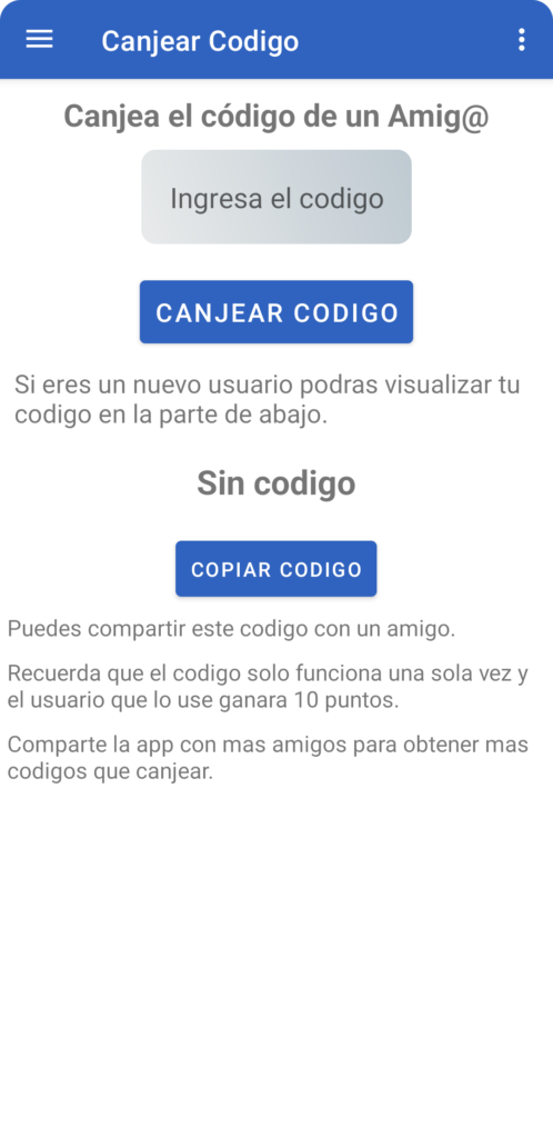 Otra forma de canjear puntos es pidiendole el codigo de nuevo usuario a tu amigo que acaba de instalar la app.